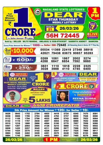 Dear Star Thursday Weekly Lottery 1pm Result 26-03-26
