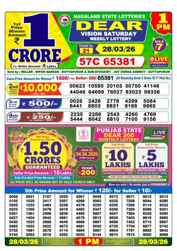 Dear Vision Saturday Weekly Lottery 1pm Result 28-03-26