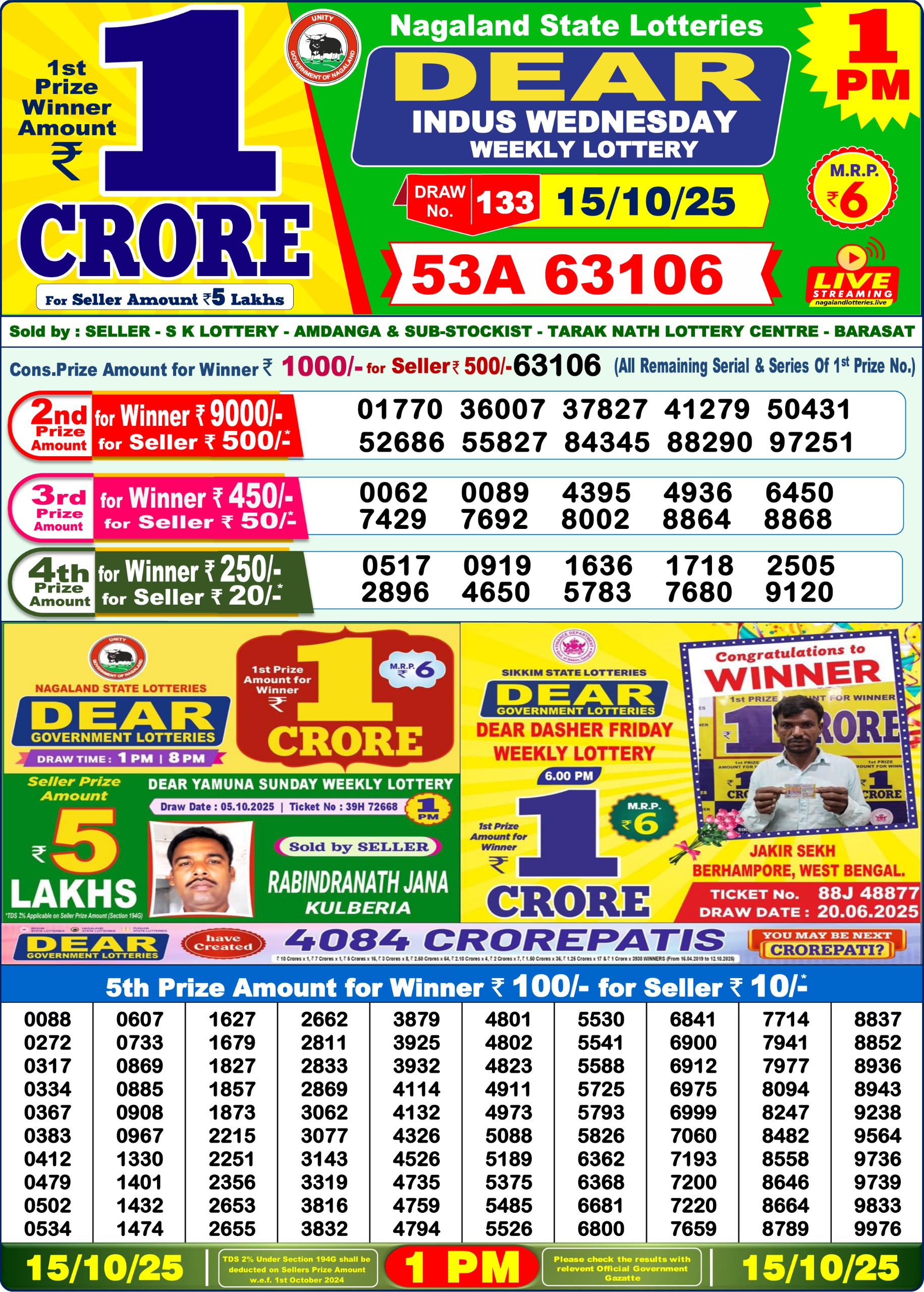 Dear Indus Wednesday Weekly Lottery 1 PM Result 15-10-25