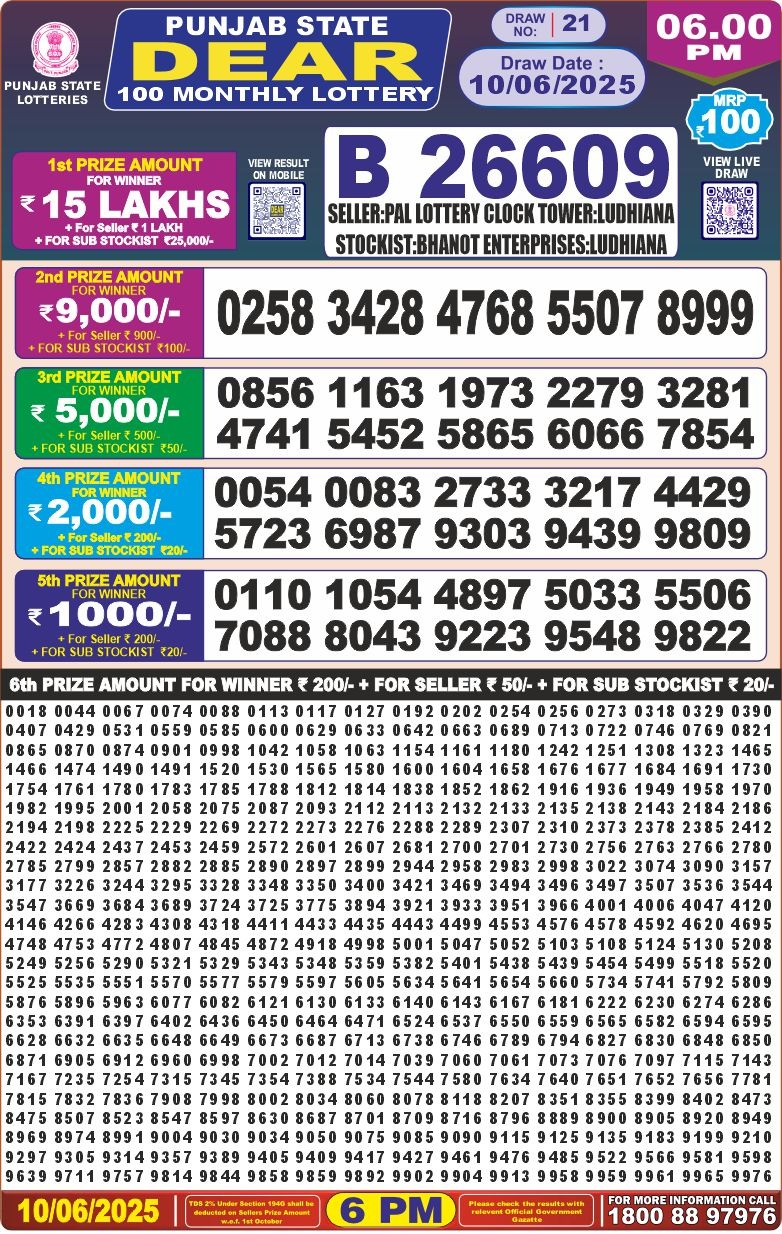 Punjab state dear 100 monthly 6 pm result 10-6-25
