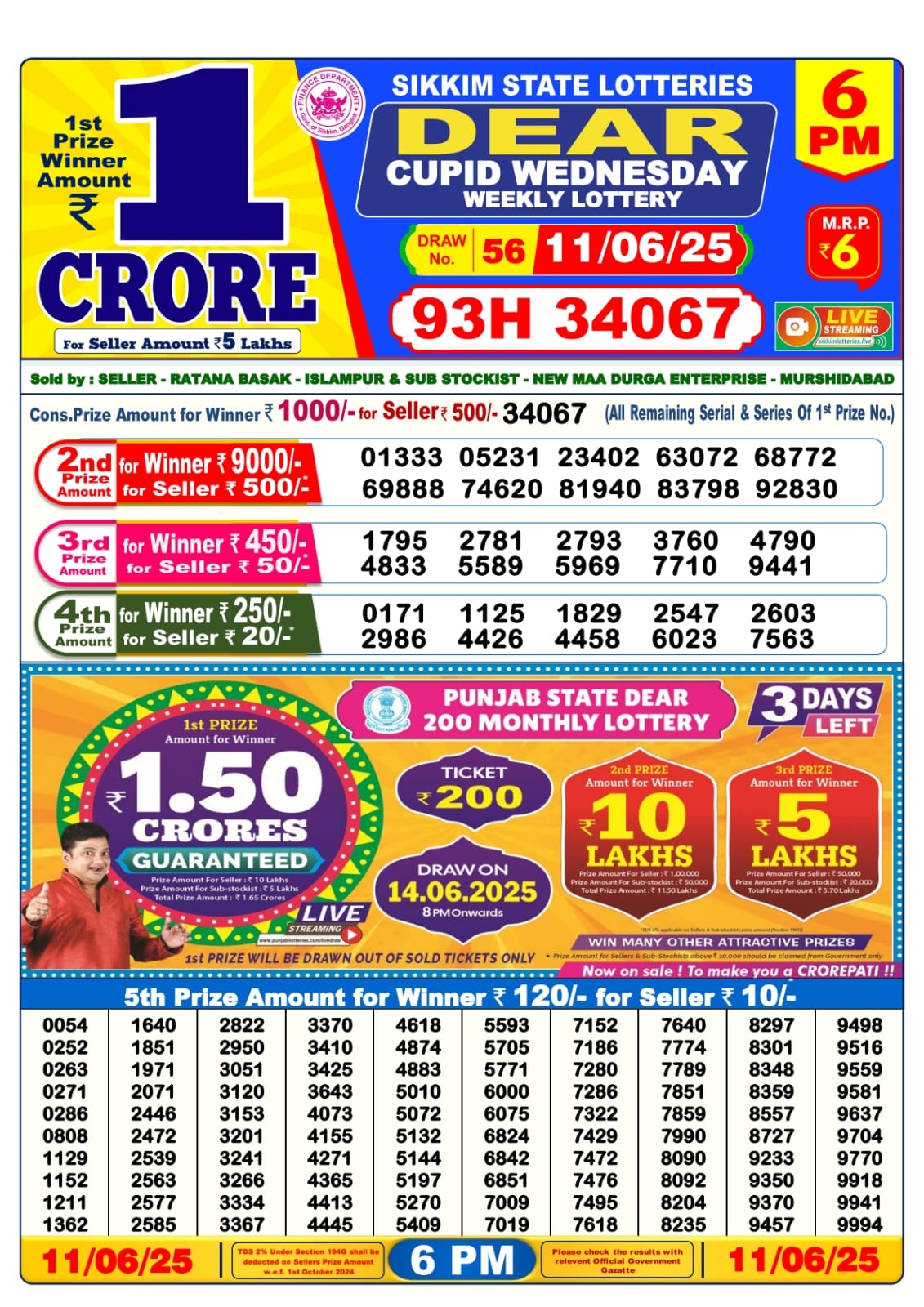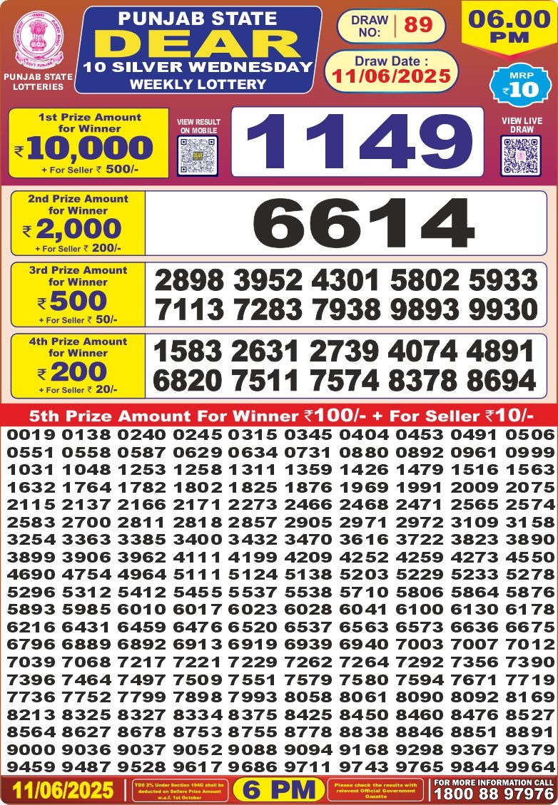 Punjab state dear 10 silver Wednesday weekly lottery 6 pm result 11-6-25