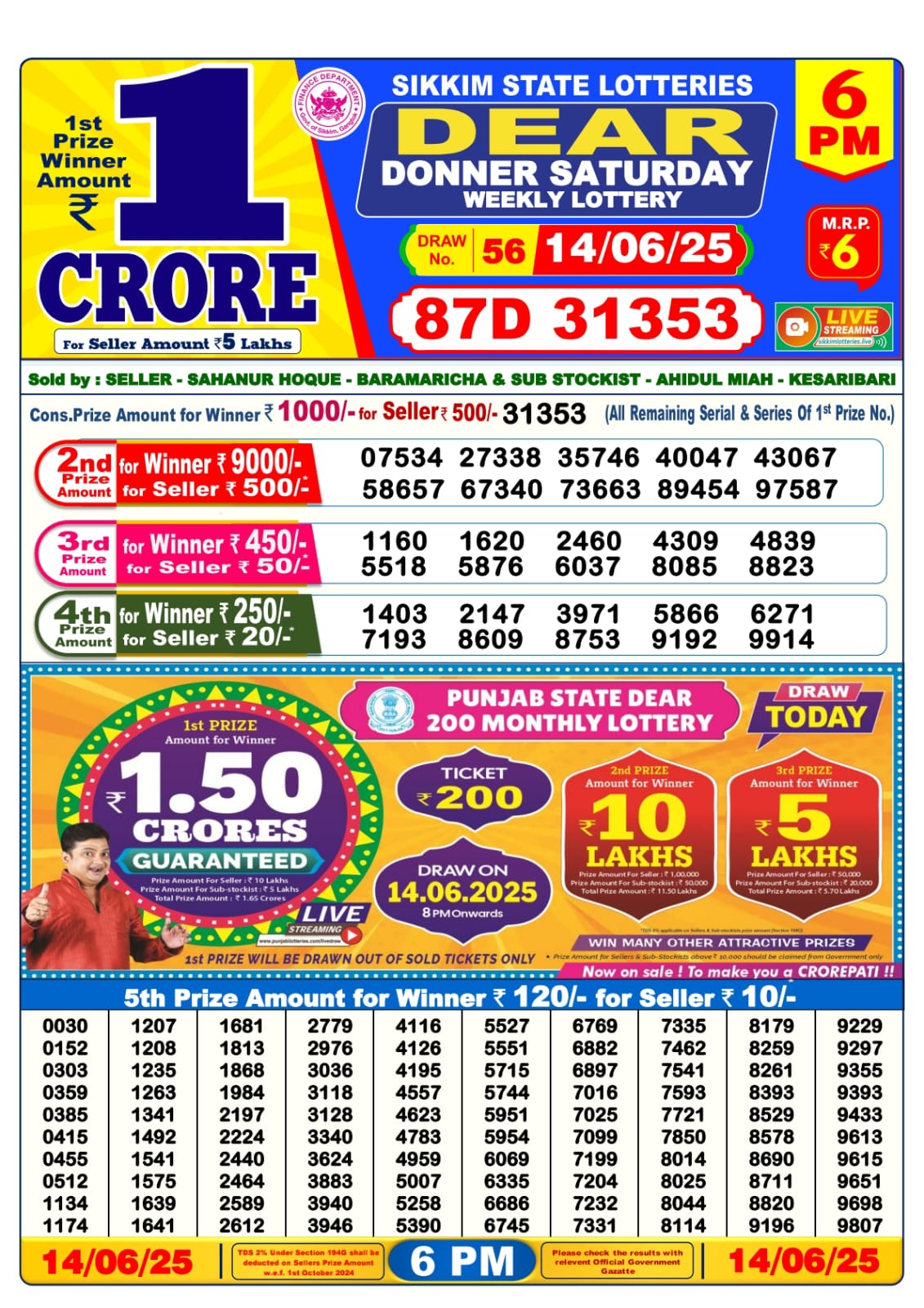 Dear donner Saturday weekly lottery 6 pm result 14-6-25