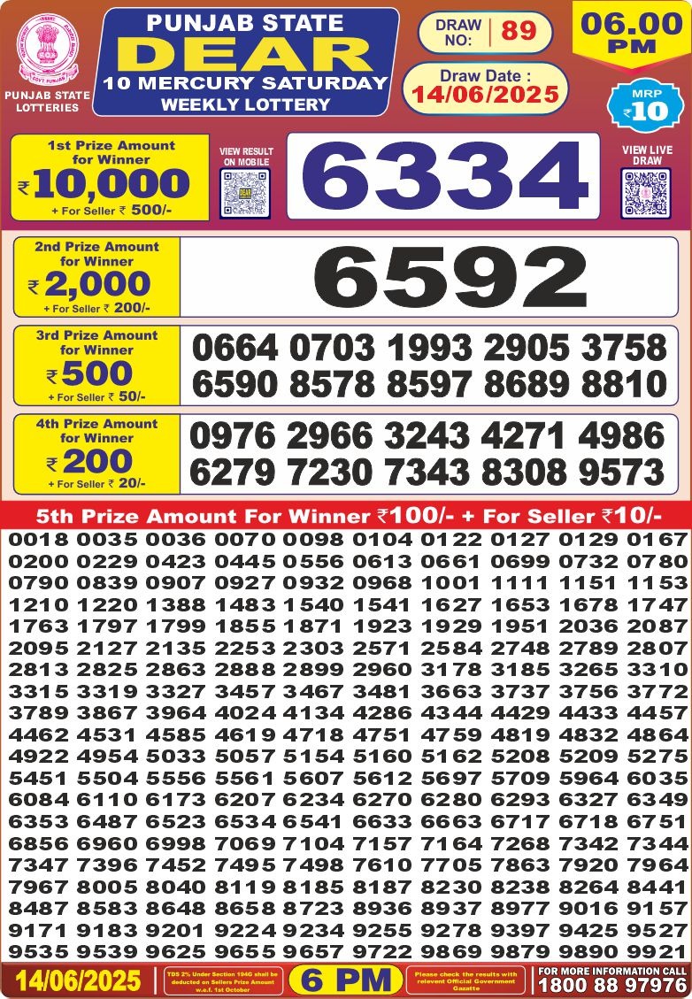 Punjab state dear 10 mercury Saturday weekly lottery 6 pm result 14-6-25