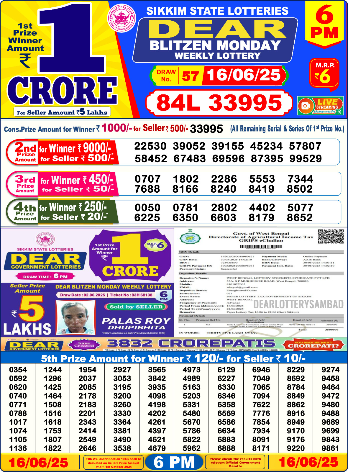 Dear blitzen monday weekly lottery 6 pm result 16-6-25