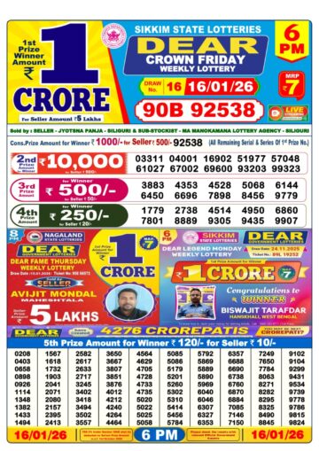 Dear Crown Friday Weekly Lottery 6pm Result 16-01-26