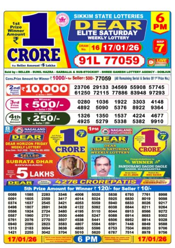 Dear Elite Saturday Weekly Lottery 6pm Result 17-01-26