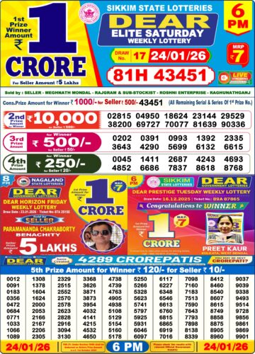 Dear Elite Saturday Weekly Lottery 6pm Result 24-01-26