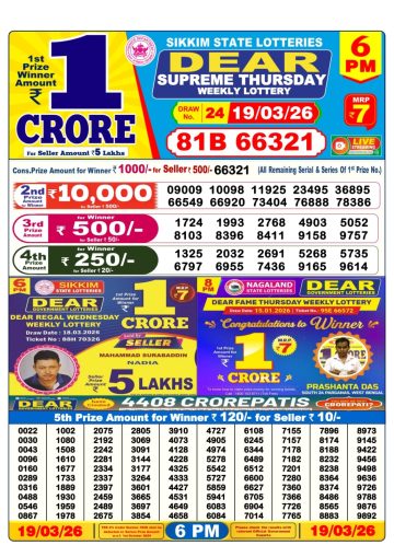 Dear Supreme Thursday Weekly Lottery 6pm Result 19-03-26
