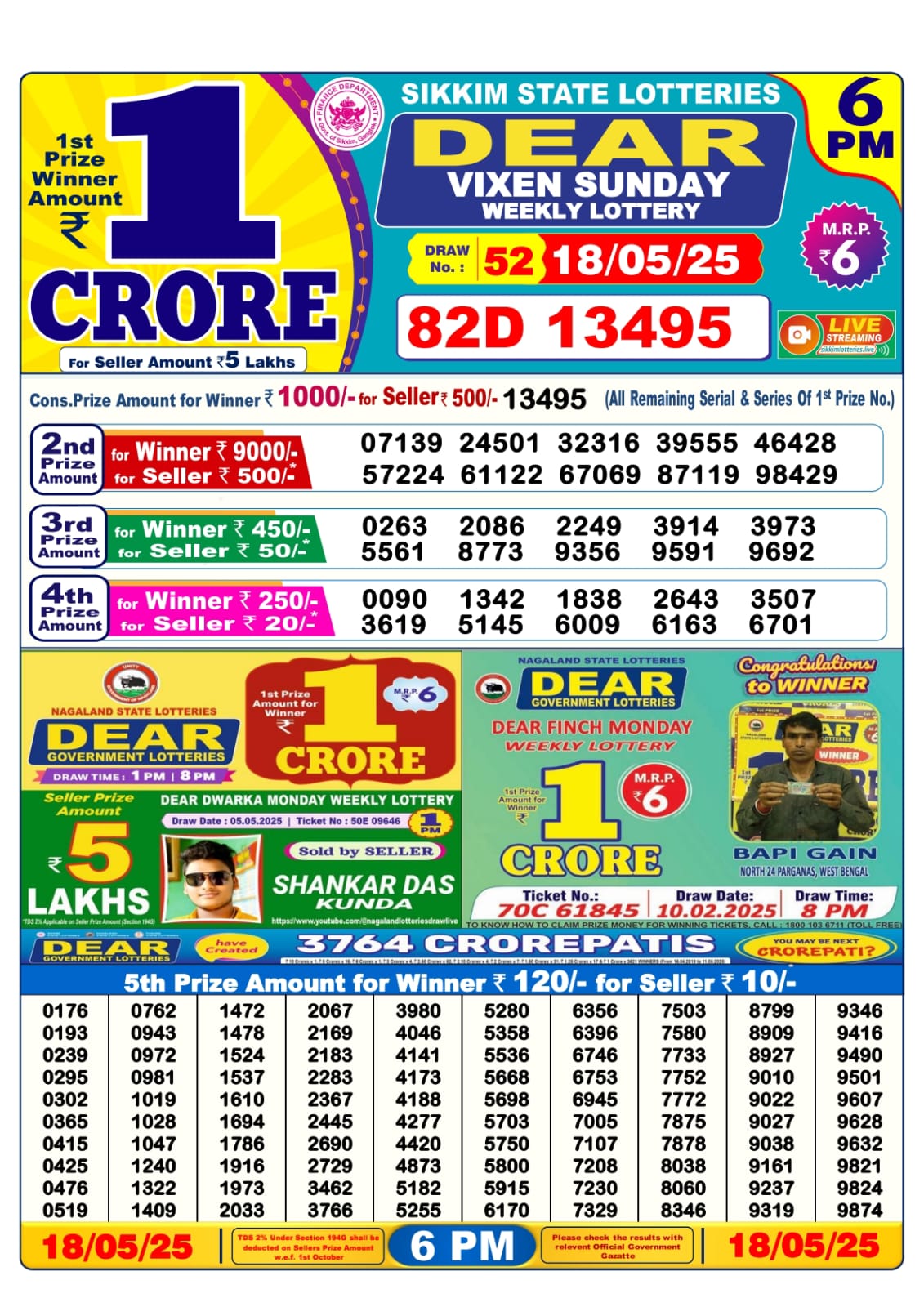 Dear vixen sunday weekly lottery 6 pm result 18-5-25