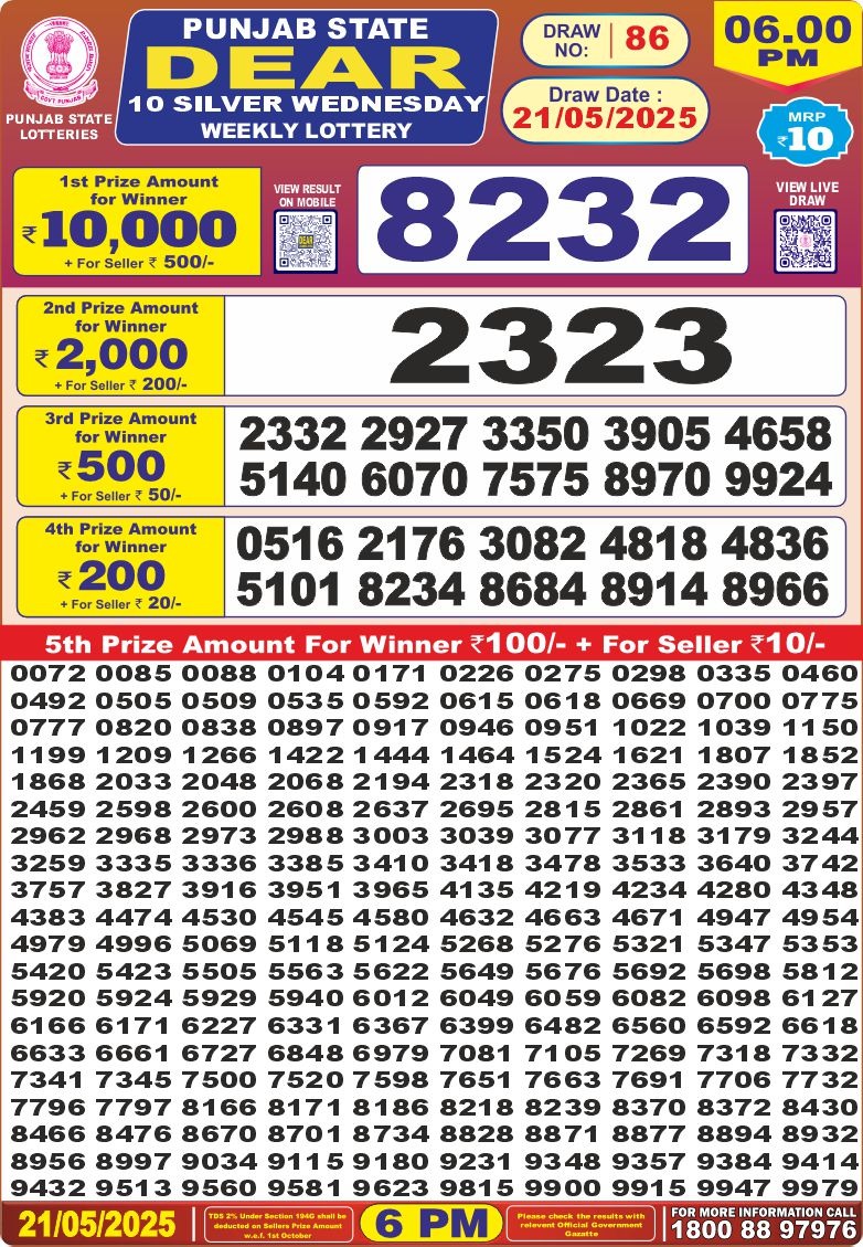 Punjab state dear 10 silver Wednesday weekly lottery 6 pm result 21-5-25