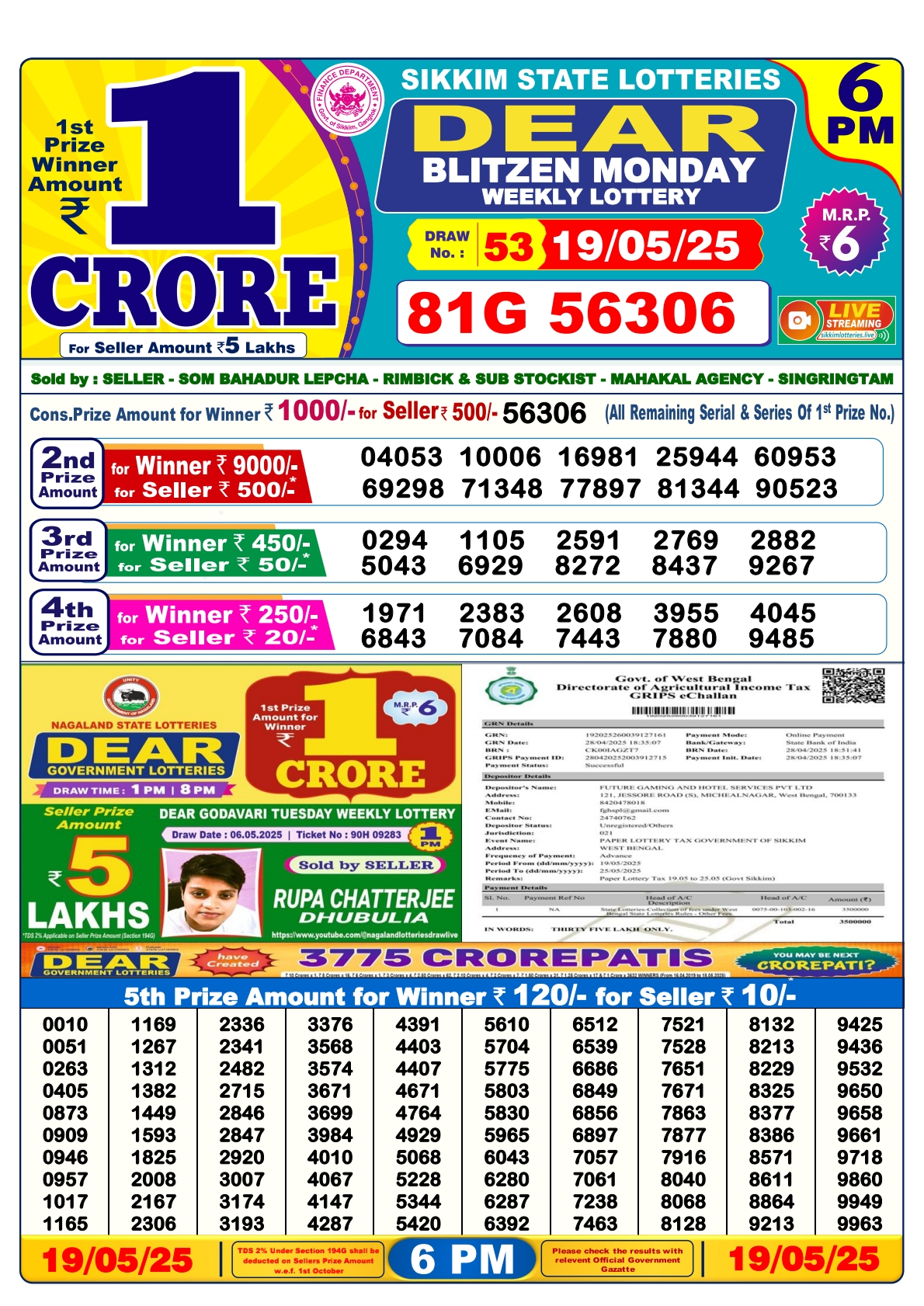 Dear blitzen monday weekly lottery 6 pm result 19-5-25