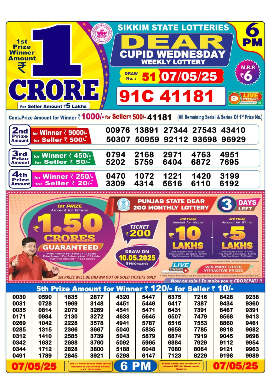Dear cupid wednesday weekly lottery 6 pm result 14-5-25