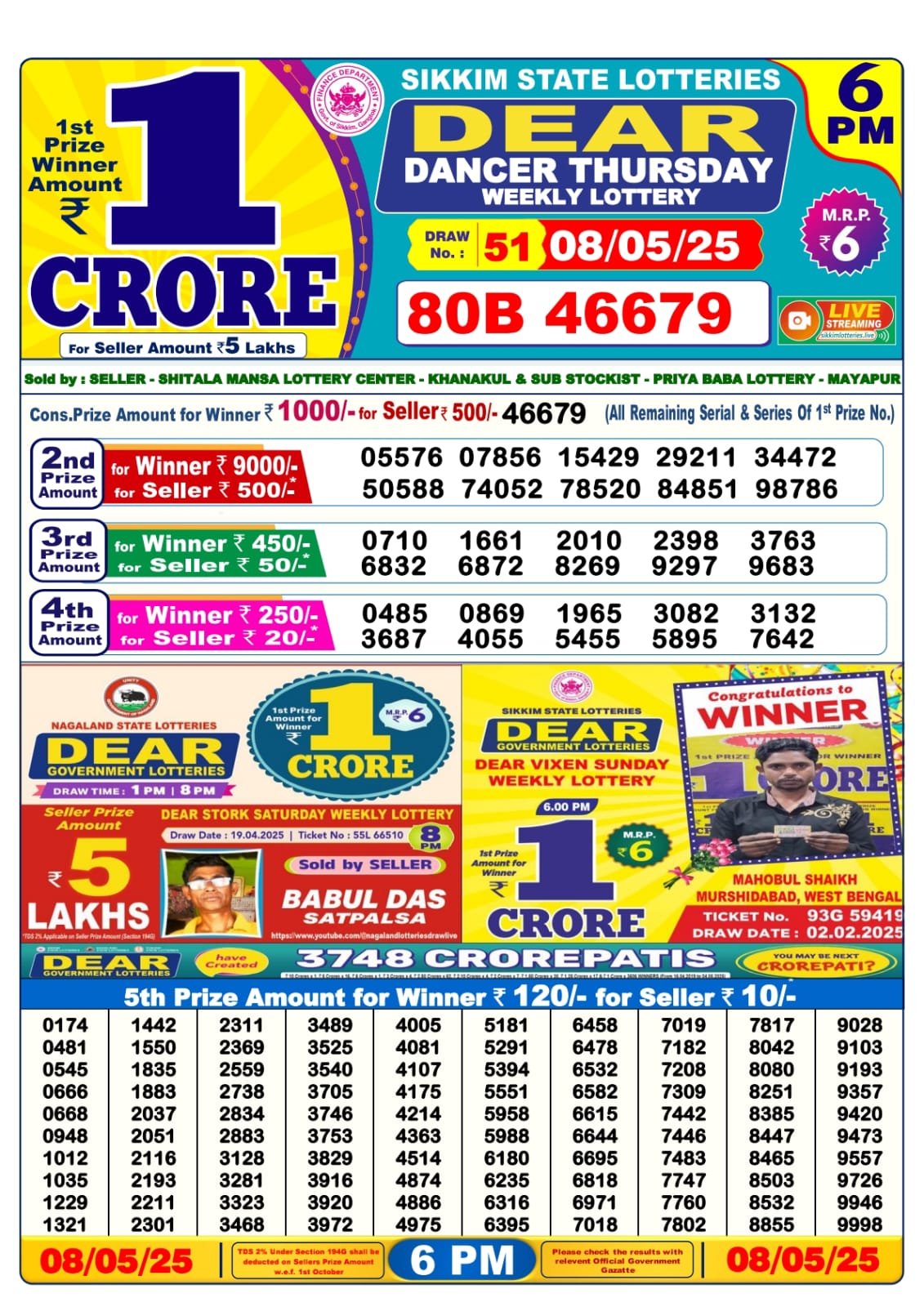 Dear dancer Thursday weekly lottery 6 pm result 8-5-25