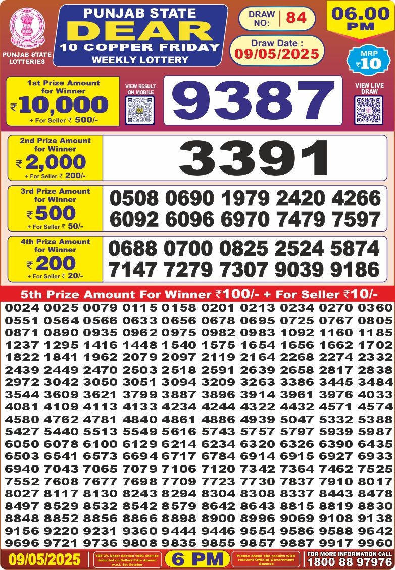 Punjab state dear 10 copper friday weekly lottery 6 pm result 9-5-25