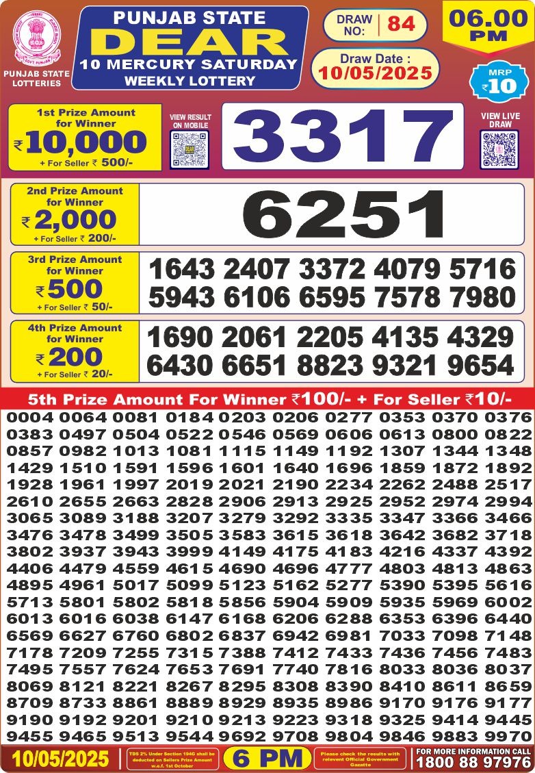Punjab state dear 10 mercury Saturday weekly lottery 6 pm result 10-5-25