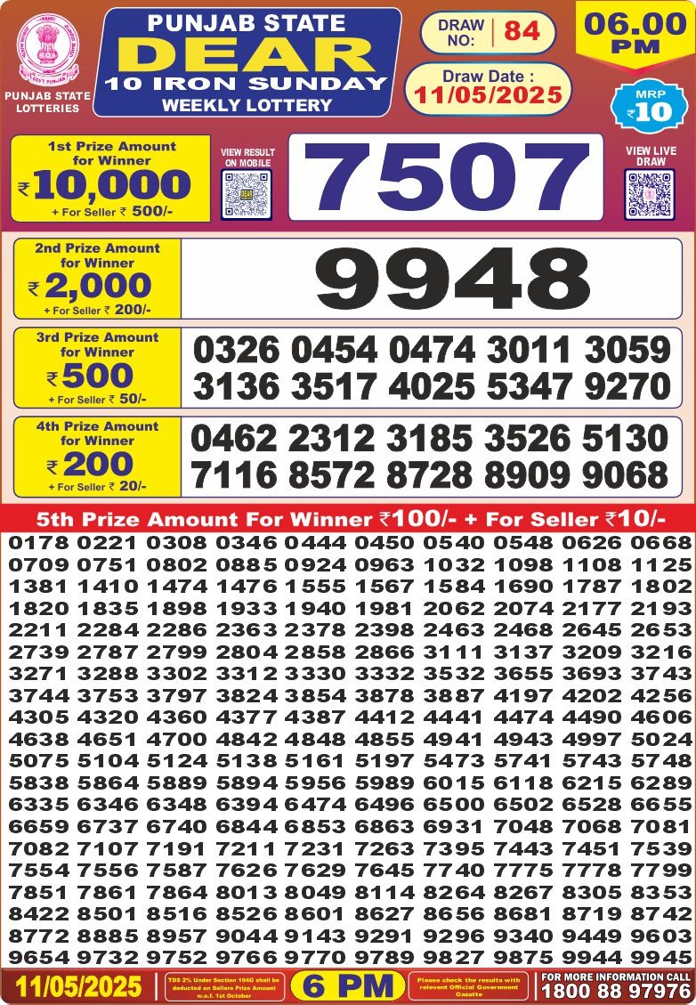 Punjab state dear 10 iron sunday weekly lottery 6 pm result 11-5-25