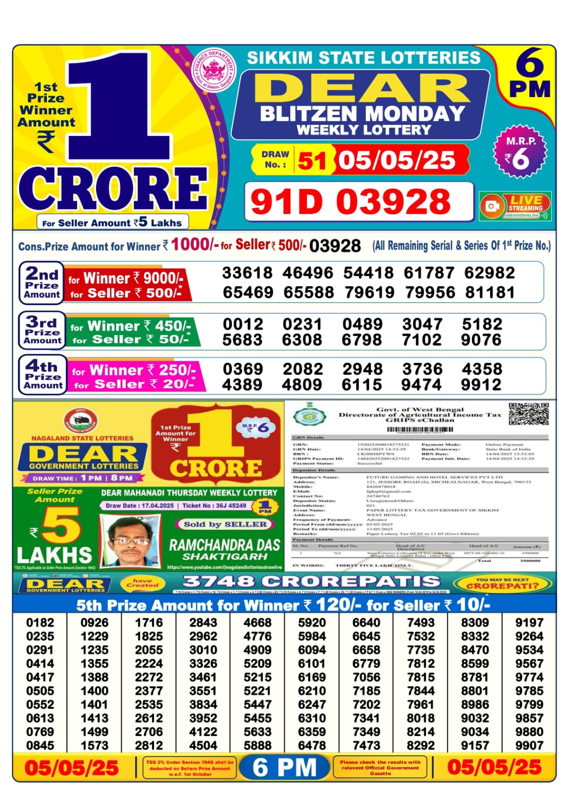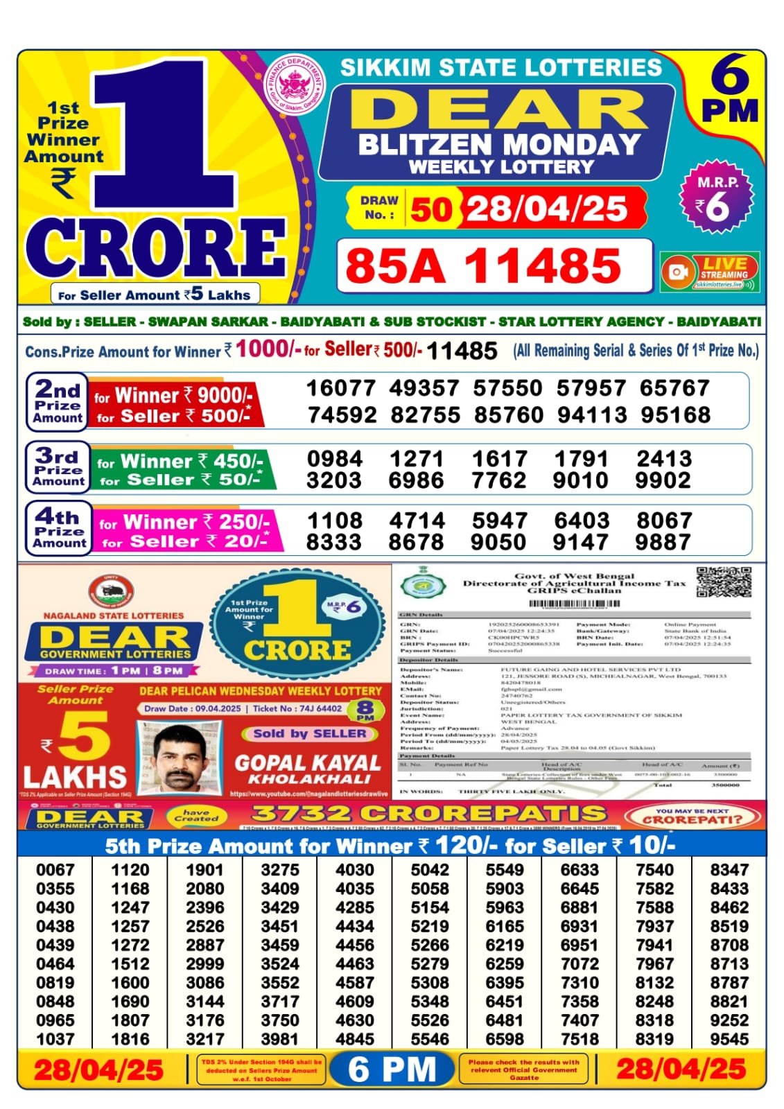 Dear blitzen monday weekly lottery 6 pm result 28-4-25