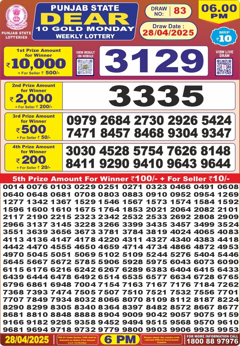 Punjab state dear 10 gold monday weekly lottery 28-4-25
