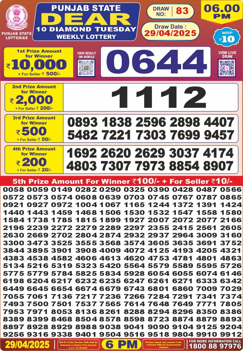 Punjab state dear 10 diamond 6 pm result 29-4-25