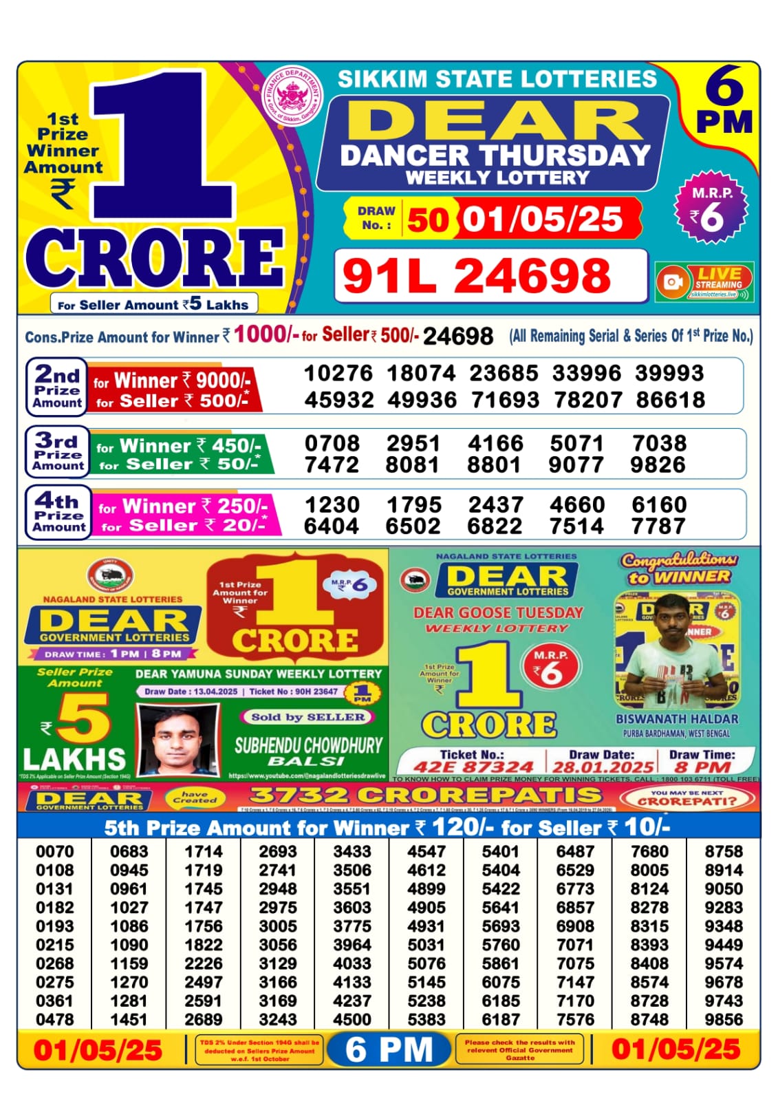 Dear dancer Thursday weekly lottery 6 pm result 1-5-25
