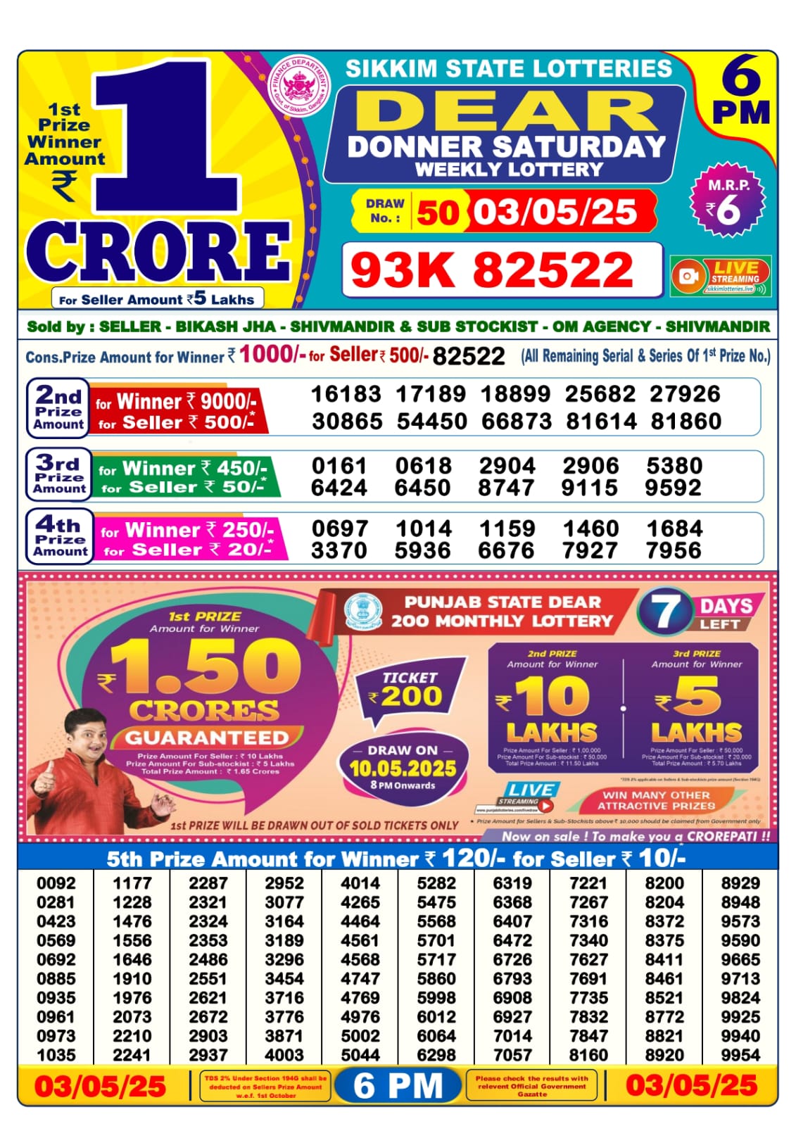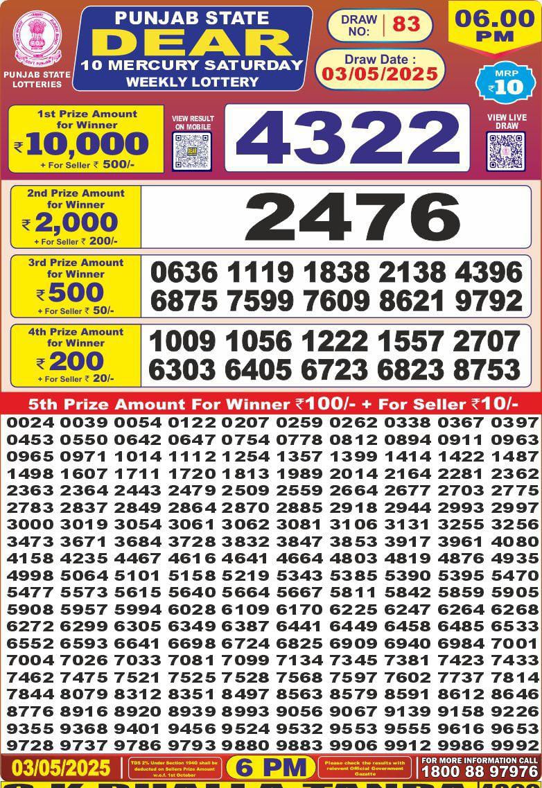 Punjab state dear 10 mercury Saturday weekly lottery 6 pm result 3-5-25