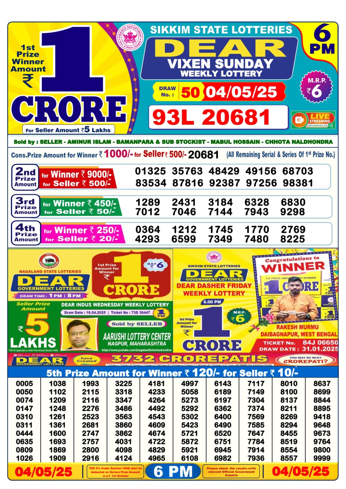 Dear vixen sunday weekly lottery 6 pm result 4-5-25