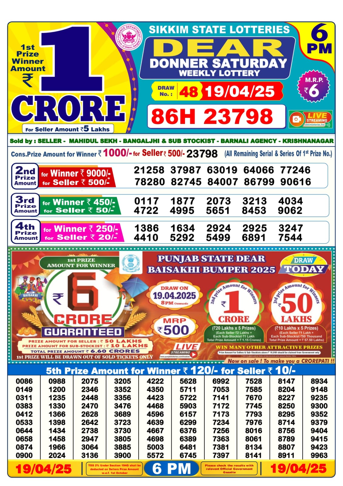 Dear donner Saturday weekly lottery 6 pm result 19-4-25