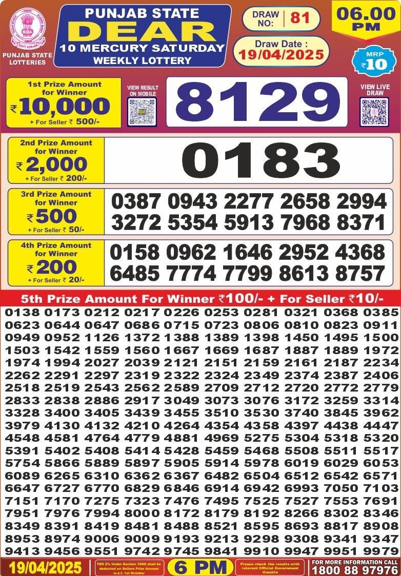 Punjab state dear 10 mercury Saturday weekly lottery 6 pm result 19-4-25