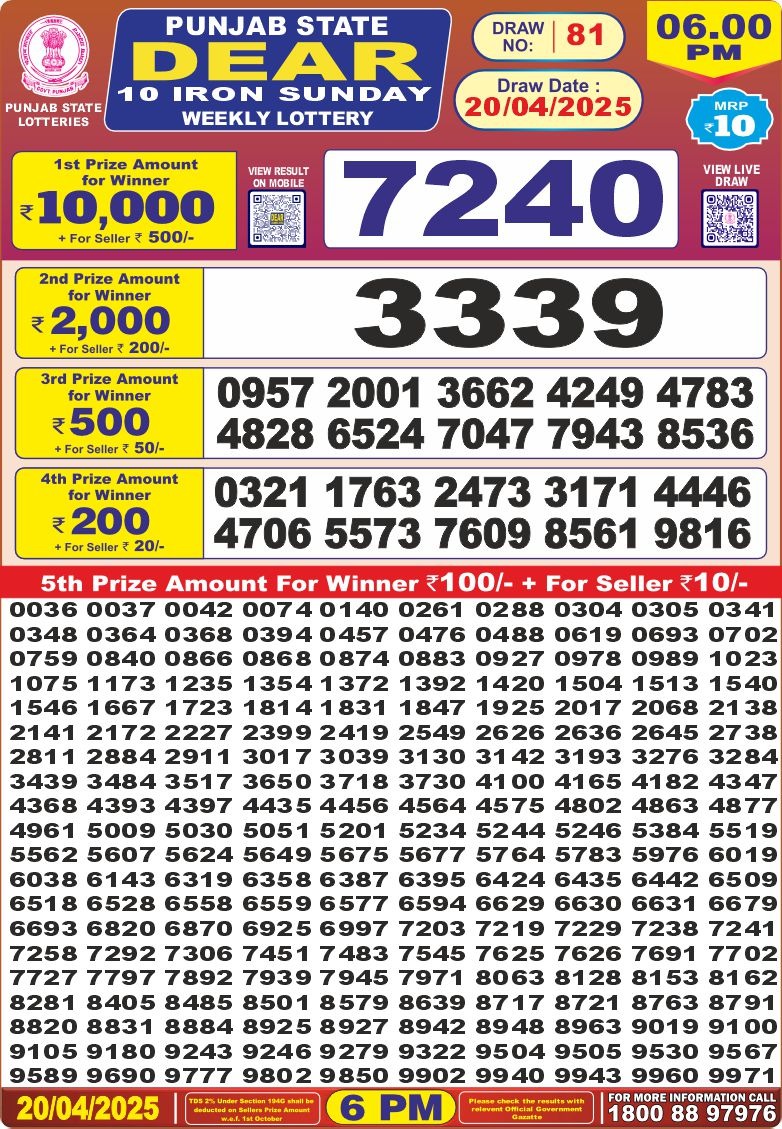 Punjab state dear 10 iron sunday weekly lottery 6 pm result 20-4-25