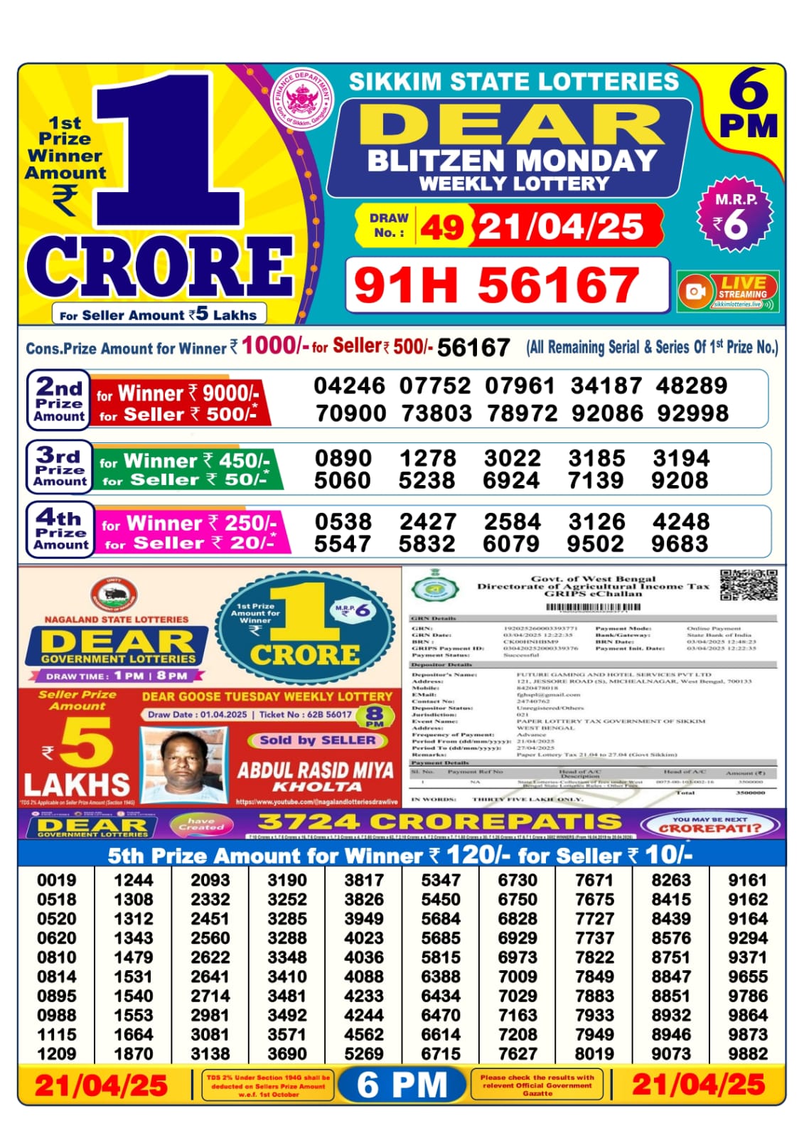 Dear blitzen monday weekly lottery 6 pm result 21-4-25