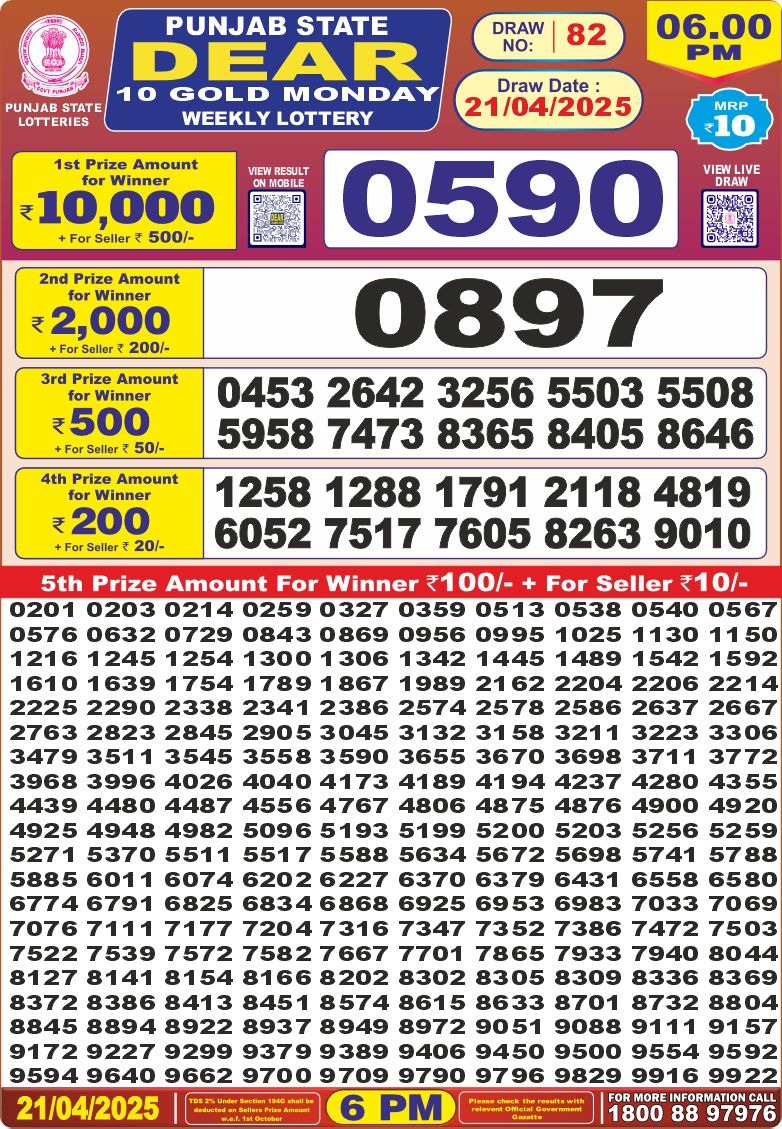 Punjab state dear 10 gold monday weekly lottery 21-4-25