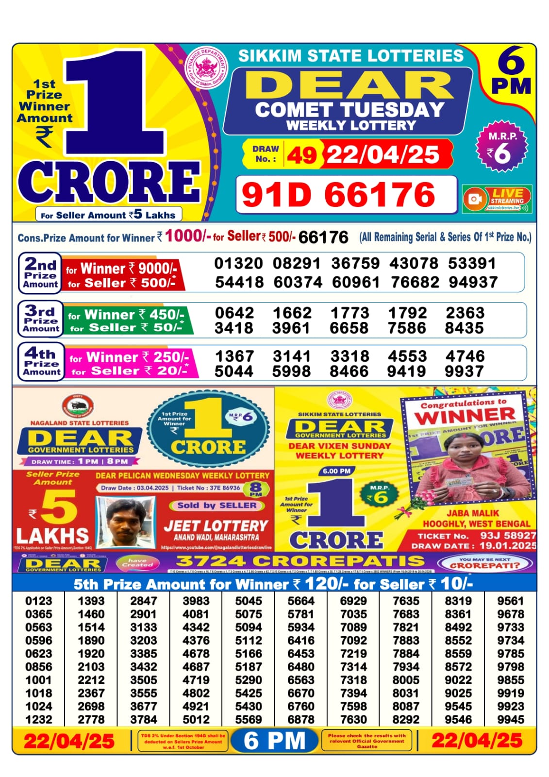 Dear comet tuesday weekly lottery 6 pm result 22-4-25