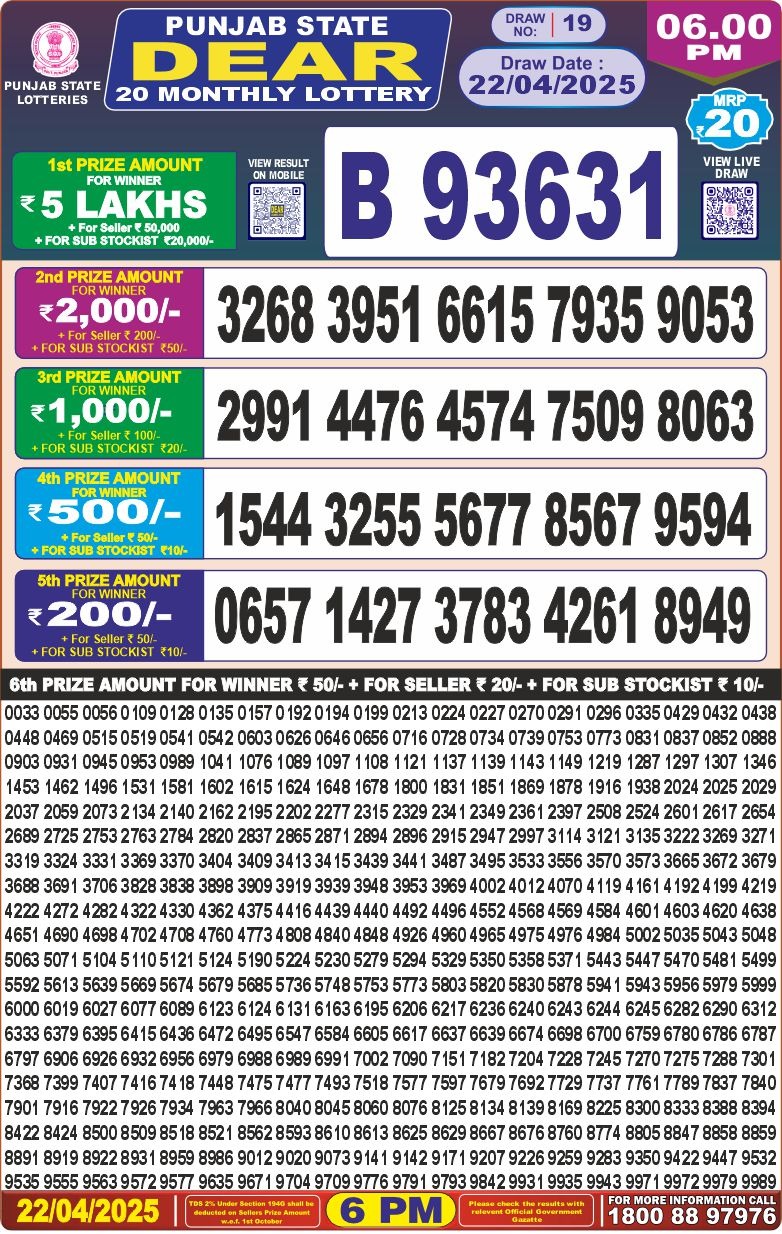 Punjab dear 20 monthly lottery result 6pm result 22-4-25