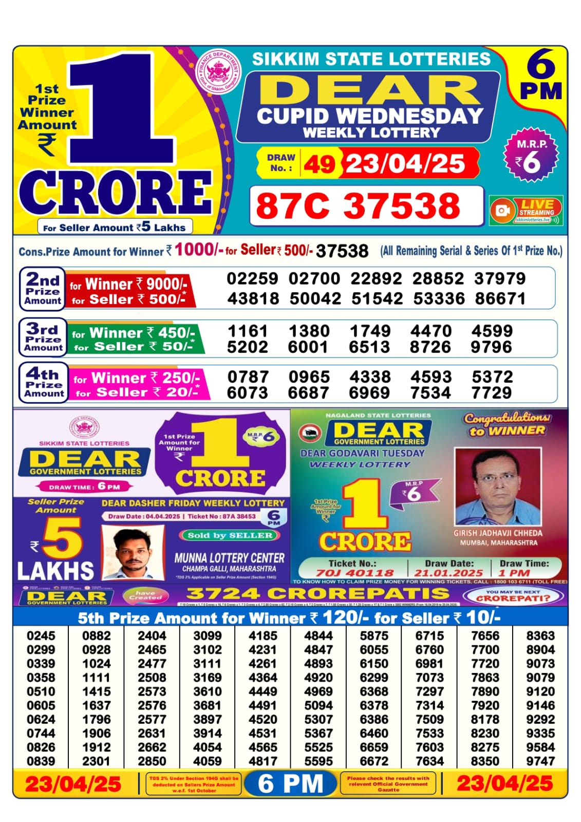 Dear cupid wednesday weekly lottery 6 pm result 23-4-25