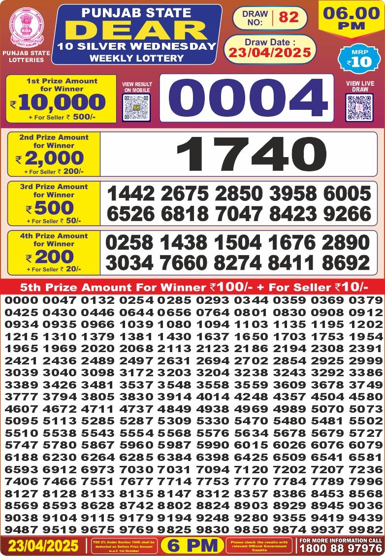 Punjab state dear 10 silver Wednesday weekly lottery 6 pm result 23-4-25