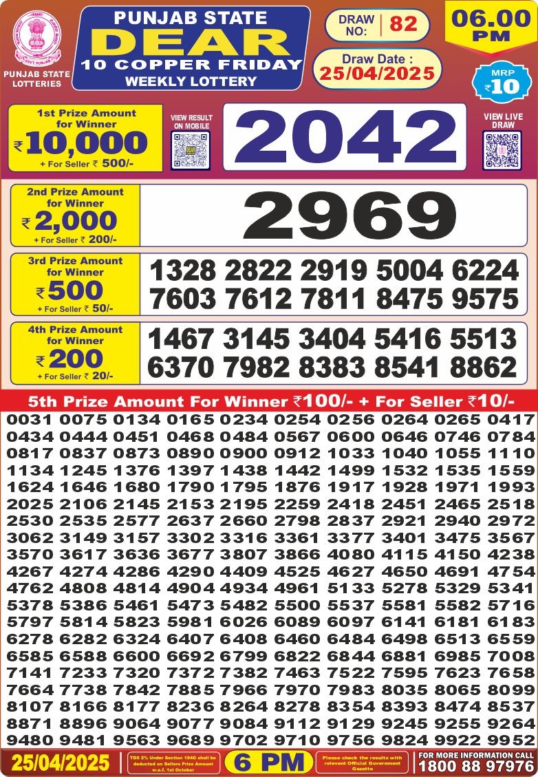 Punjab state dear 10 copper friday weekly lottery 6 pm result 25-4-25