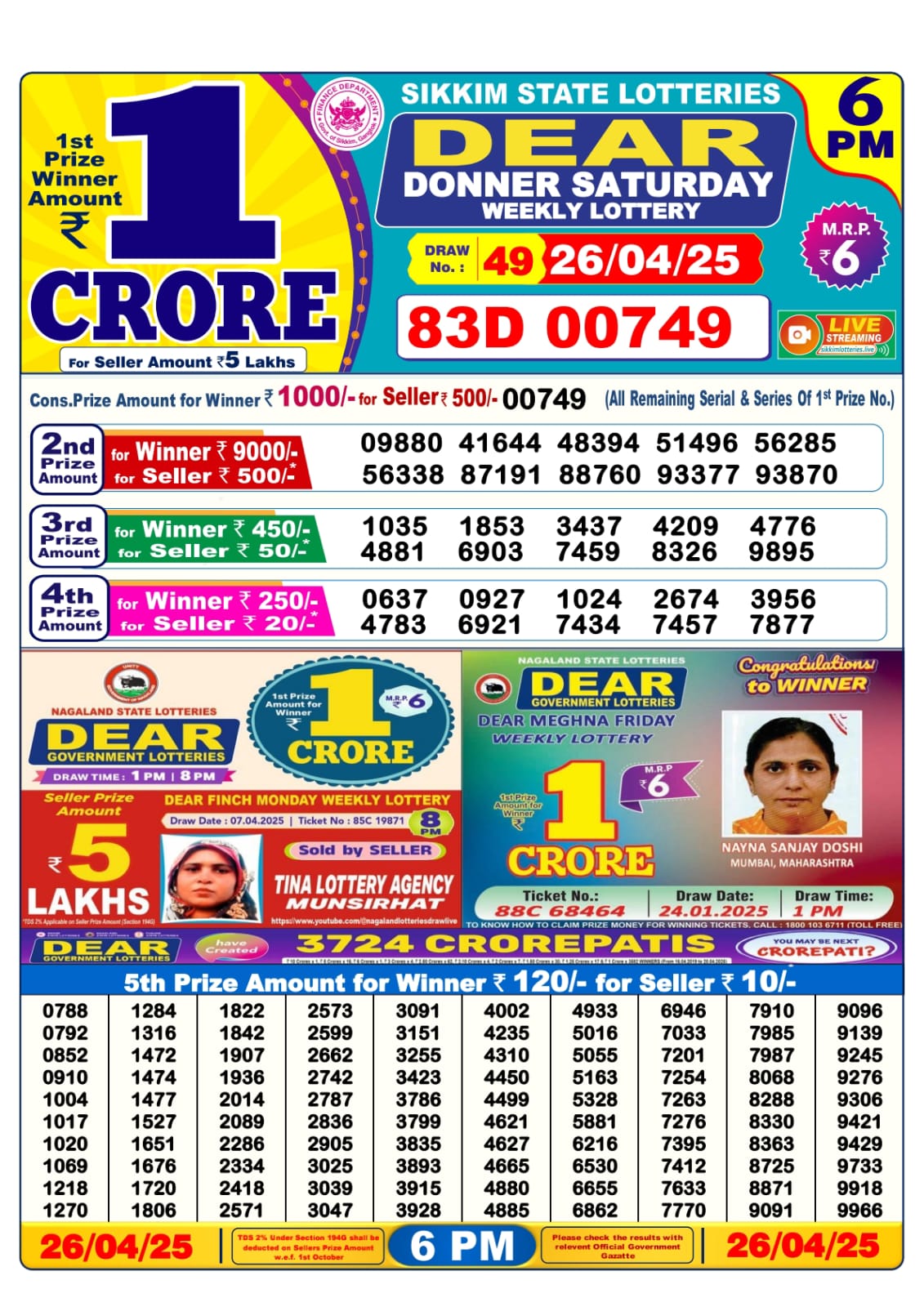 Dear donner Saturday weekly lottery 6 pm result 26-4-25