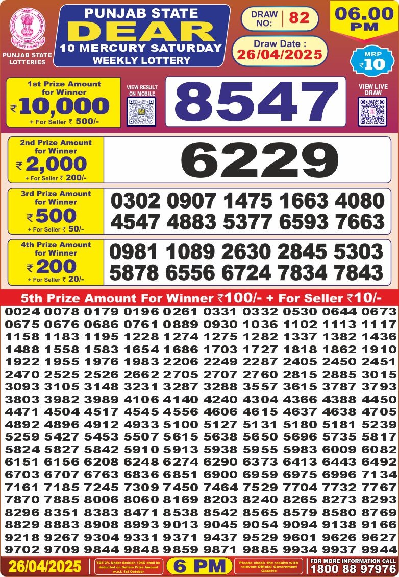 Punjab state dear 10 mercury Saturday weekly lottery 6 pm result 26-4-25