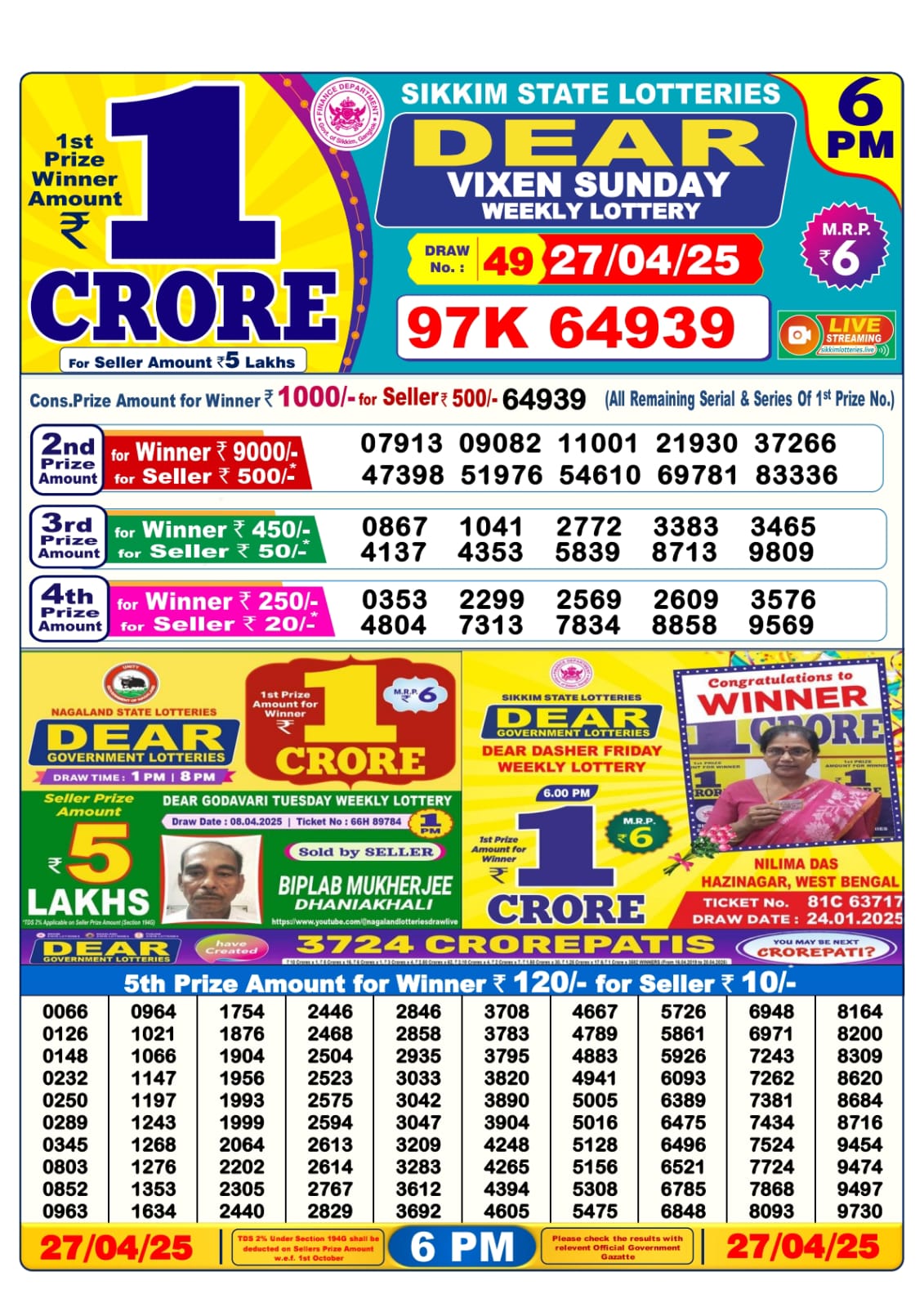 Dear vixen sunday weekly lottery 6 pm result 27-4-25