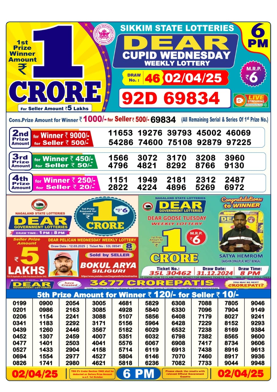 Dear cupid wednesday weekly lottery 6 pm result 2-4-25