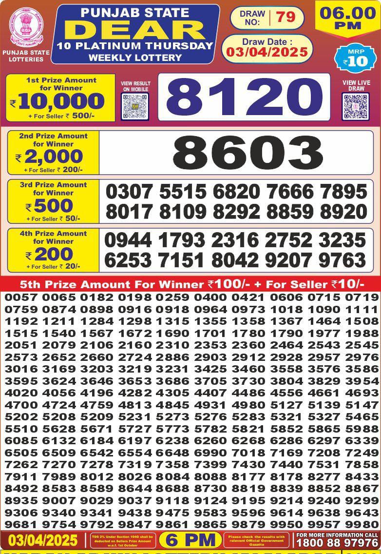 Punjab state dear 10 platinum Thursday weekly lottery 6 pm result 3-4-25