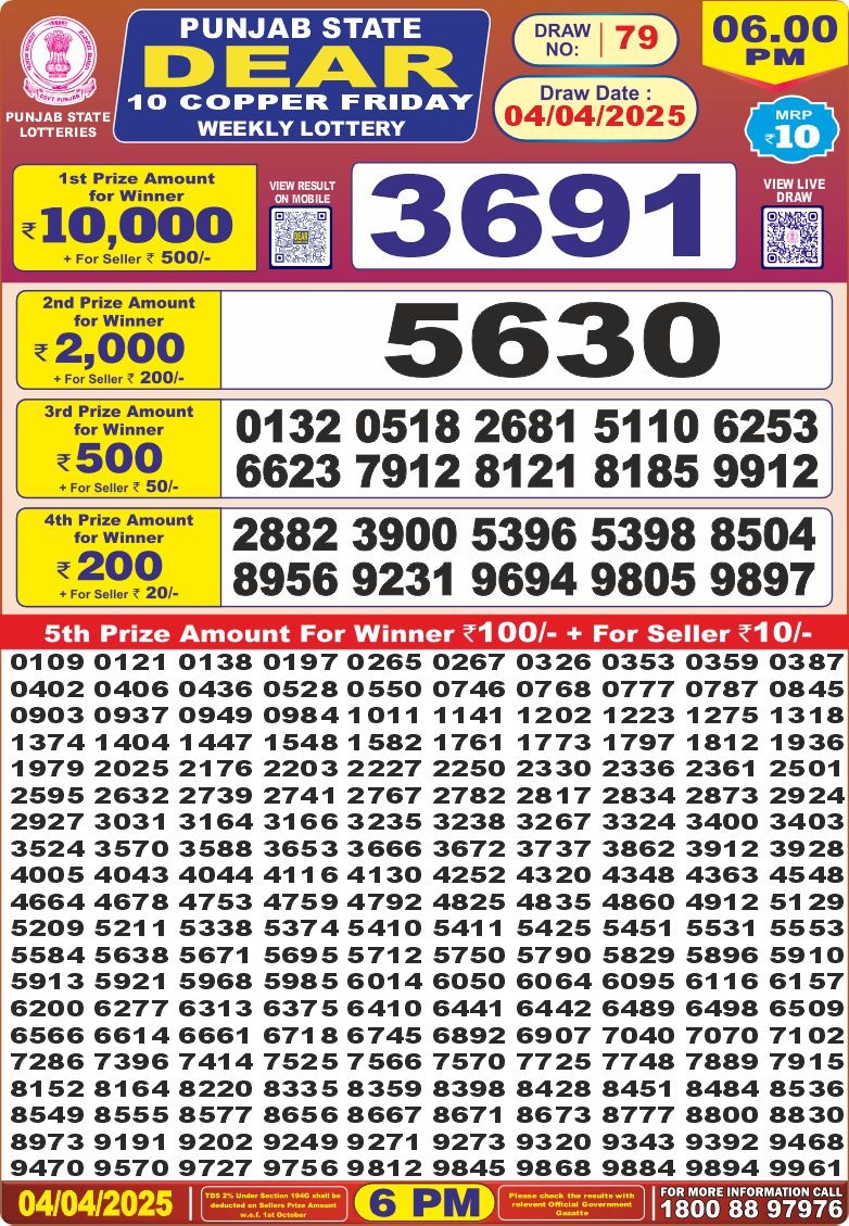 Punjab state dear 10 copper friday weekly lottery 6 pm result 4-4-25