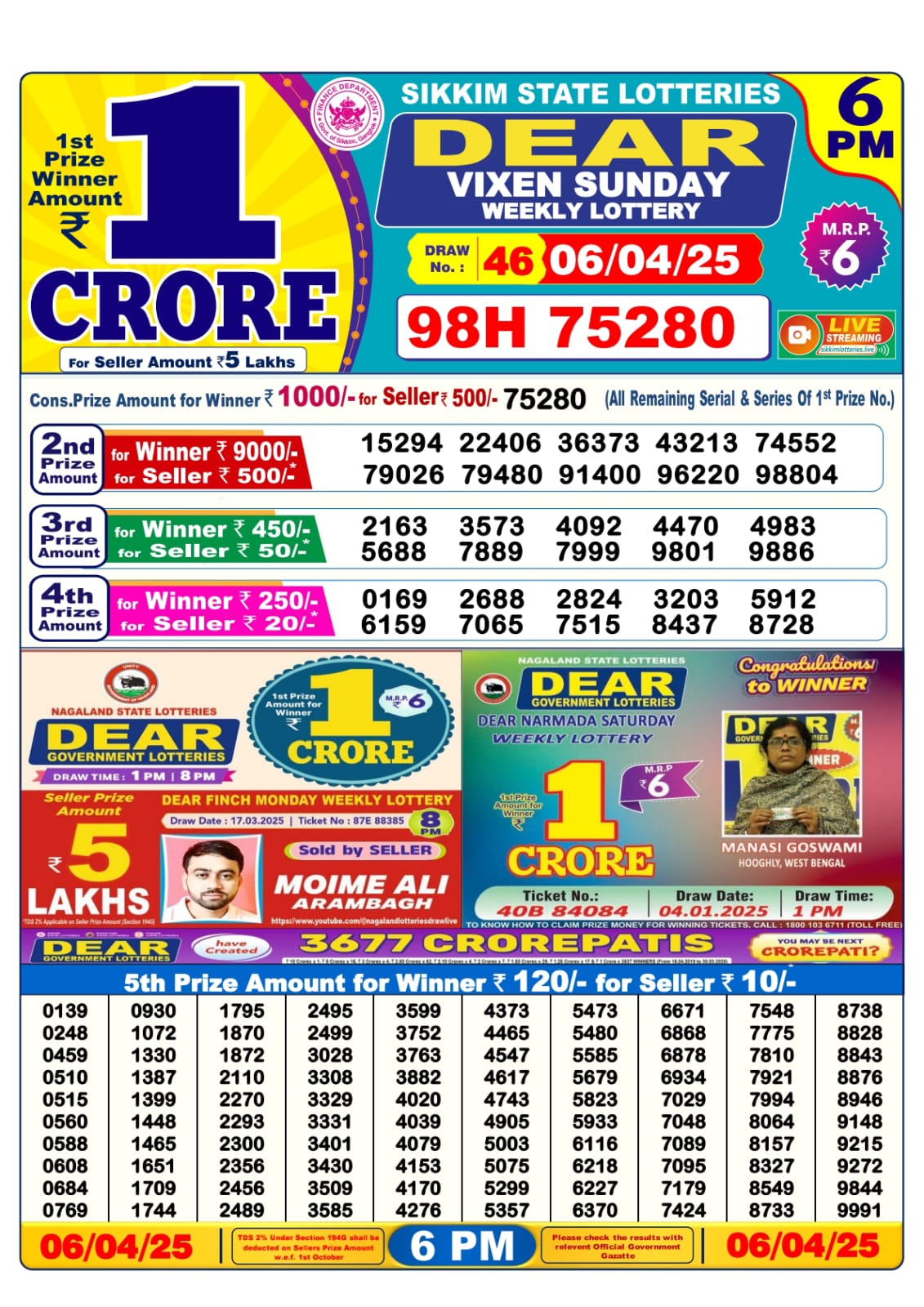 Dear vixen sunday weekly lottery 6 pm result 6-4-25