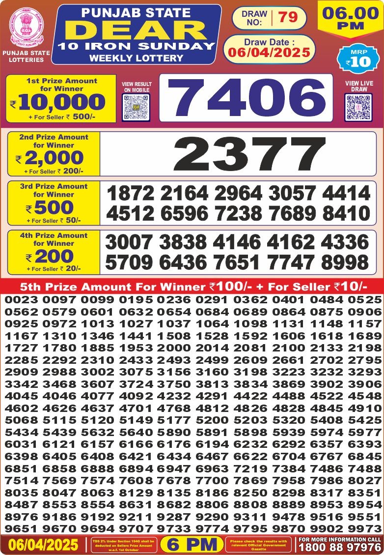 Punjab state dear 10 iron sunday weekly lottery 6 pm result 6-4-25