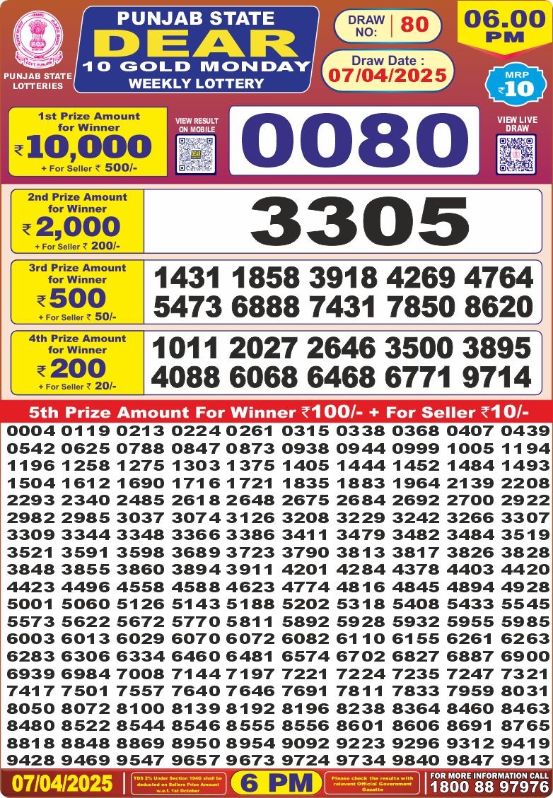 Punjab state dear 10 gold monday weekly lottery 7-4-25