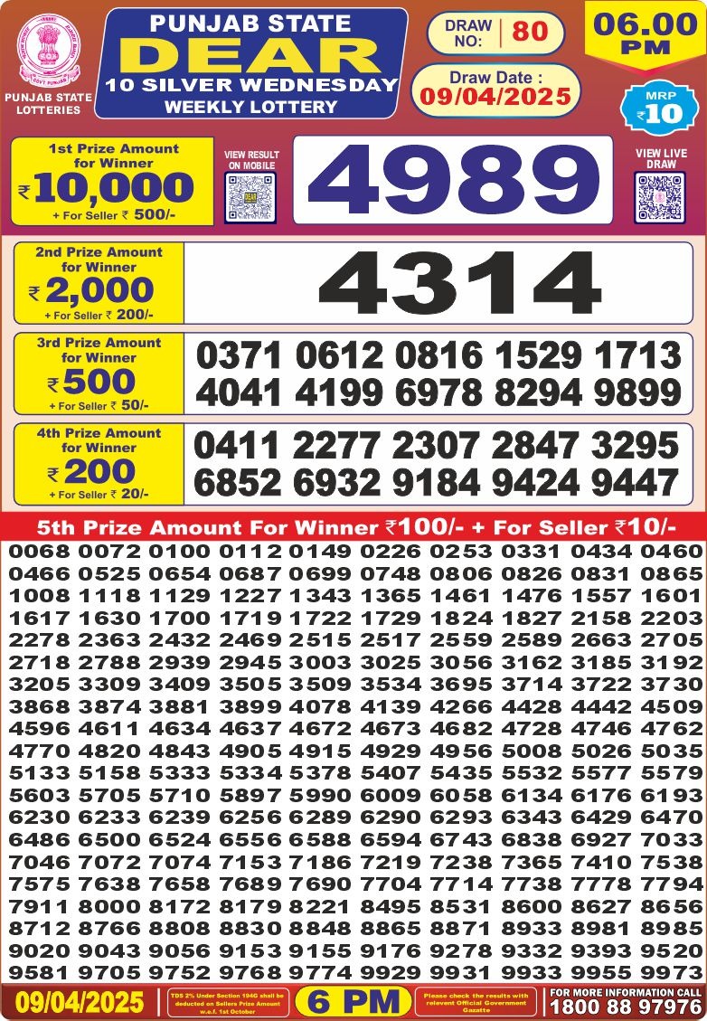 Punjab state dear 10 silver Wednesday weekly lottery 6 pm result 9-4-25