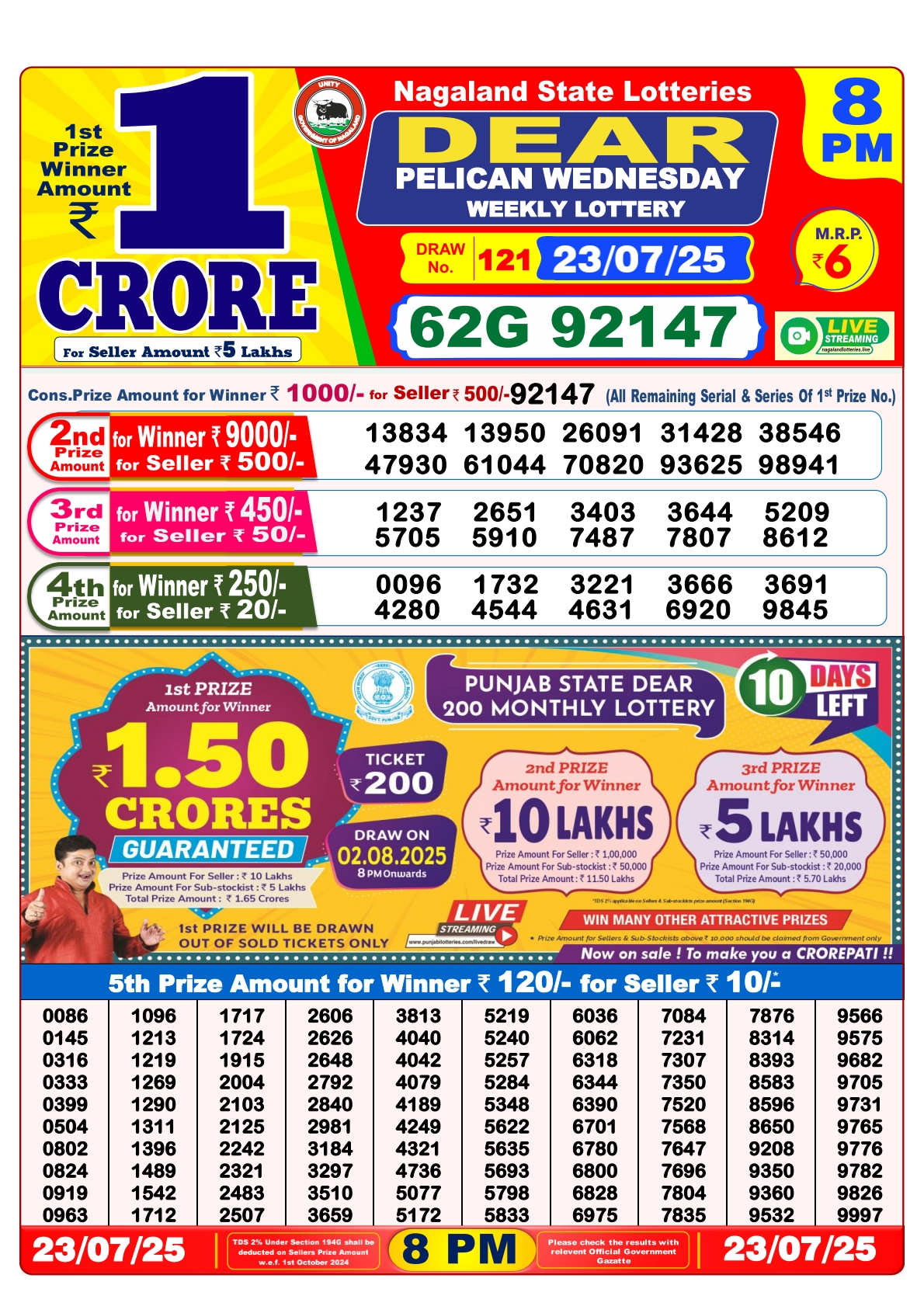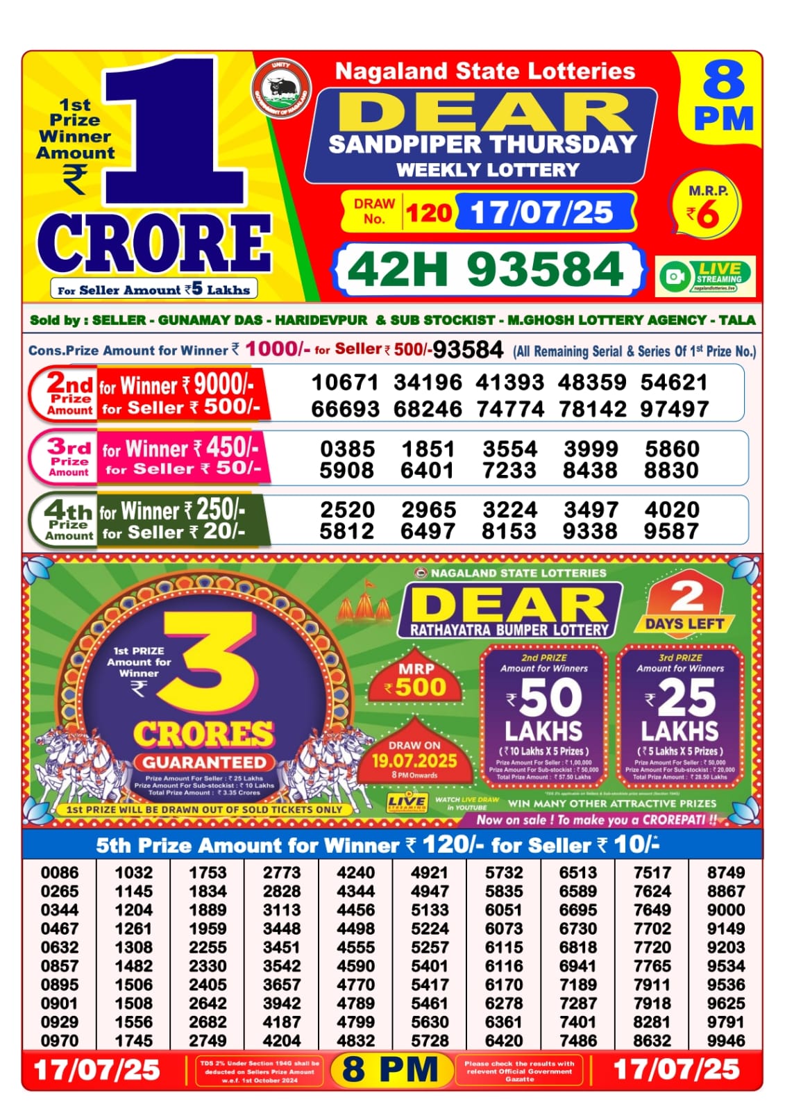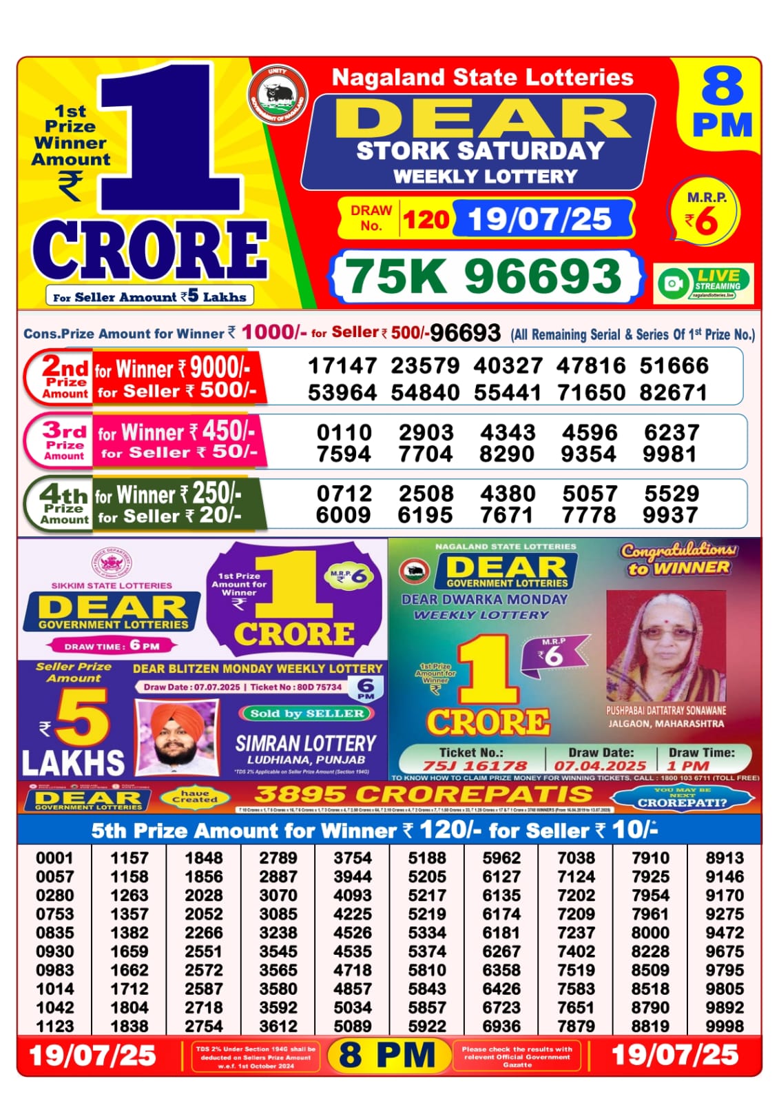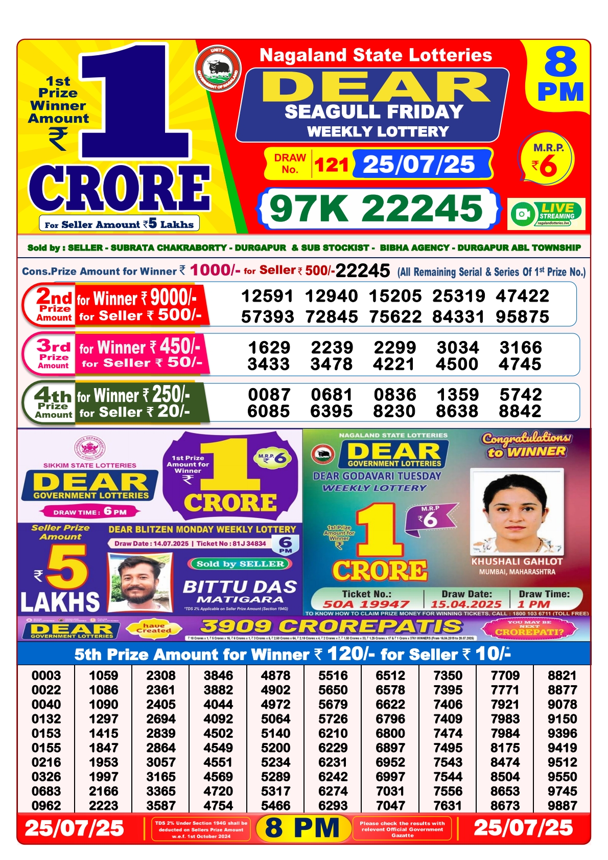 Dear seagull friday weekly lottery 8 pm result 25-7-25
