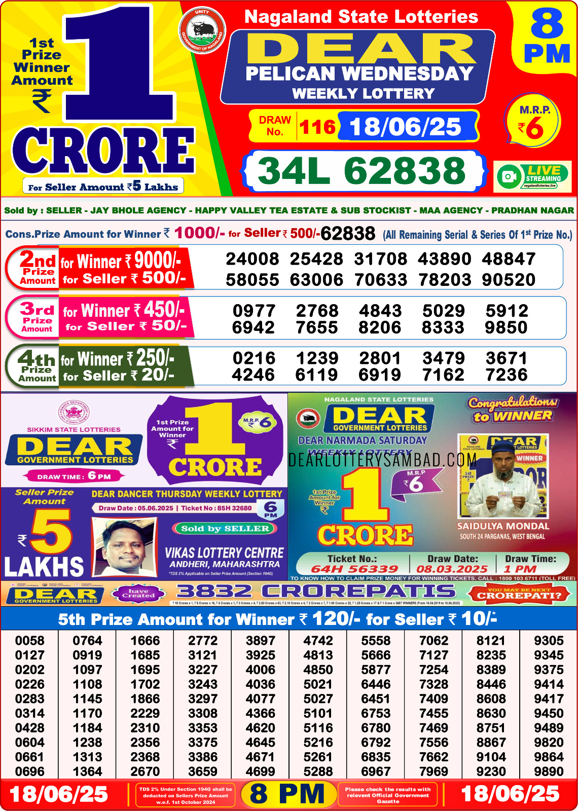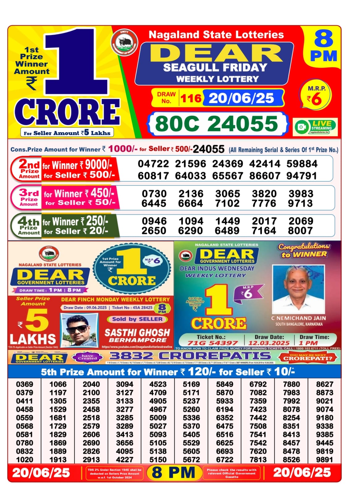 Dear seagull friday weekly lottery 8 pm result 20-6-25
