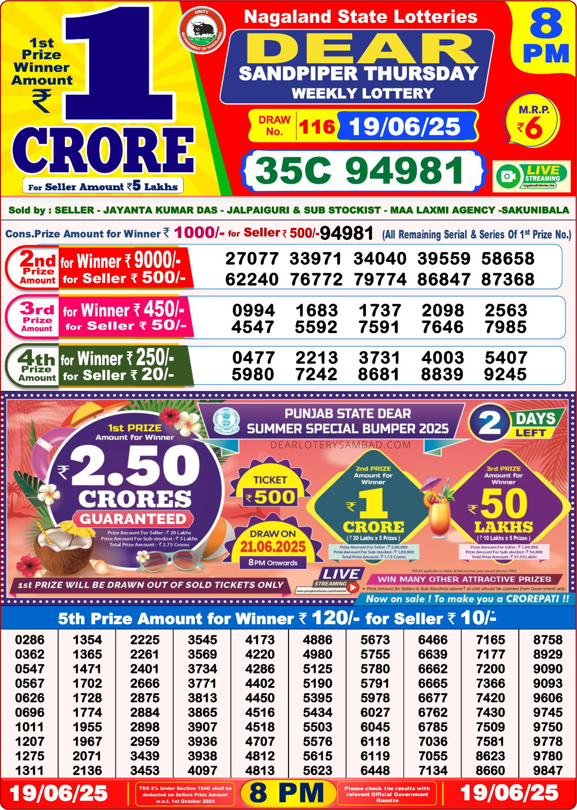 Dear sandpiper Thursday weekly lottery 8 pm result 19-6-25