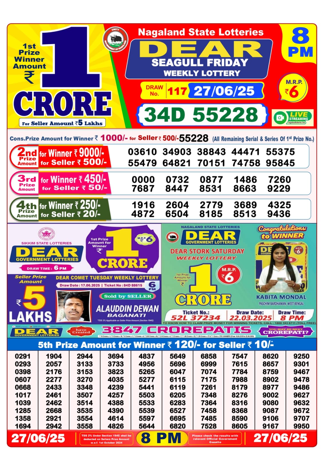 Dear seagull friday weekly lottery 8 pm result 27-6-25